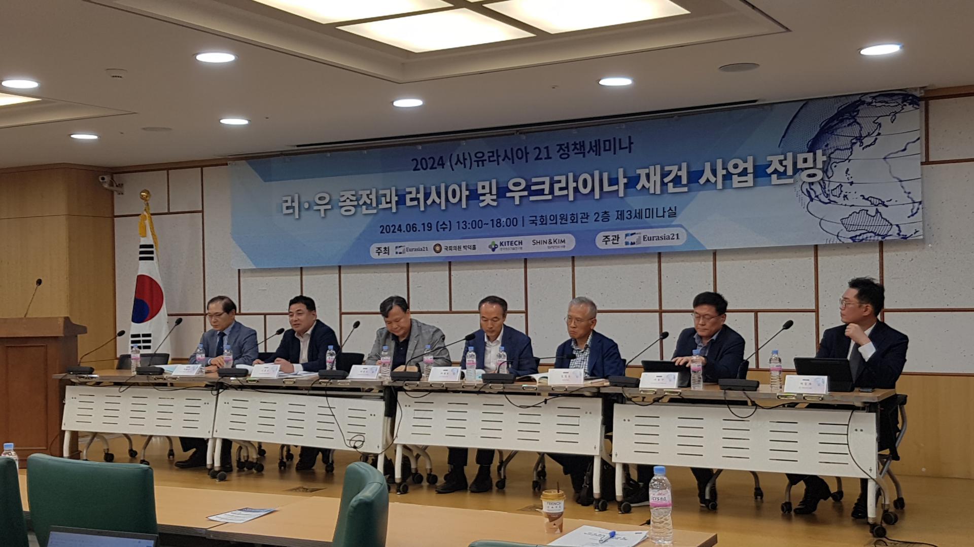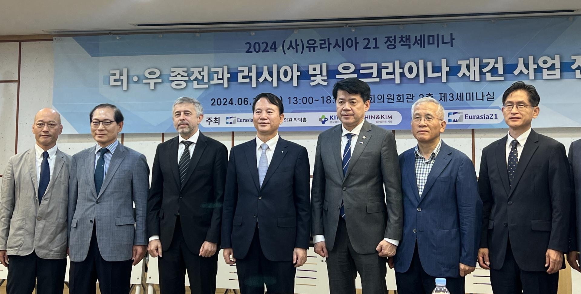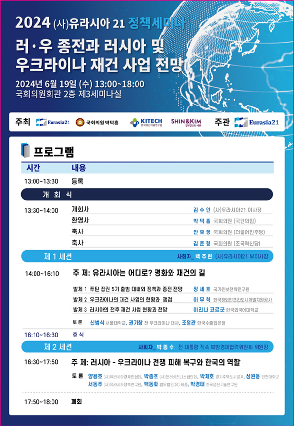 사단법인 유라시아21은 오는 19일 오후 국회의원회관 제3세미나실에서 '러-중 종전과 러시아 및 우크라이나 재건 사업 전망'이라는 주제로 정책세미나를 연다. 박덕흠 국회의원실, 한국생산기술연구원, 법무법인 세종이 공동 주최한다.
